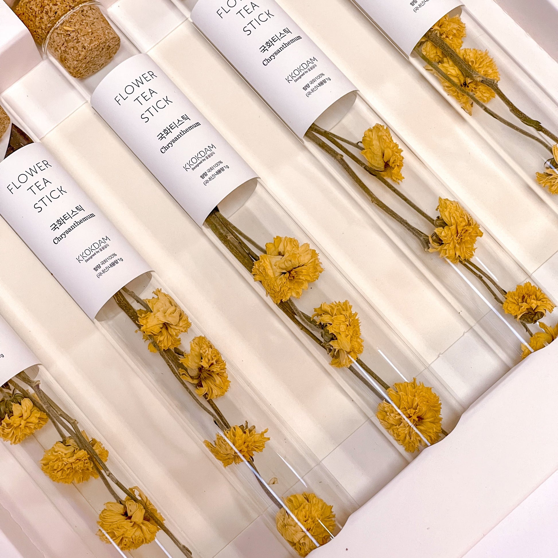 Blumenteestäbchen sind eine völlig neue Idee und ein innovatives Konzept für Tee. Sie bieten Tee in Form einer Blume mit Stiel. Entworfen von KKOKDAM, verbindet dieses seit seiner Einführung in Korea beliebte Markenprodukt den Genuss hochwertigen Tees in Verbindung mit visueller Schönheit.