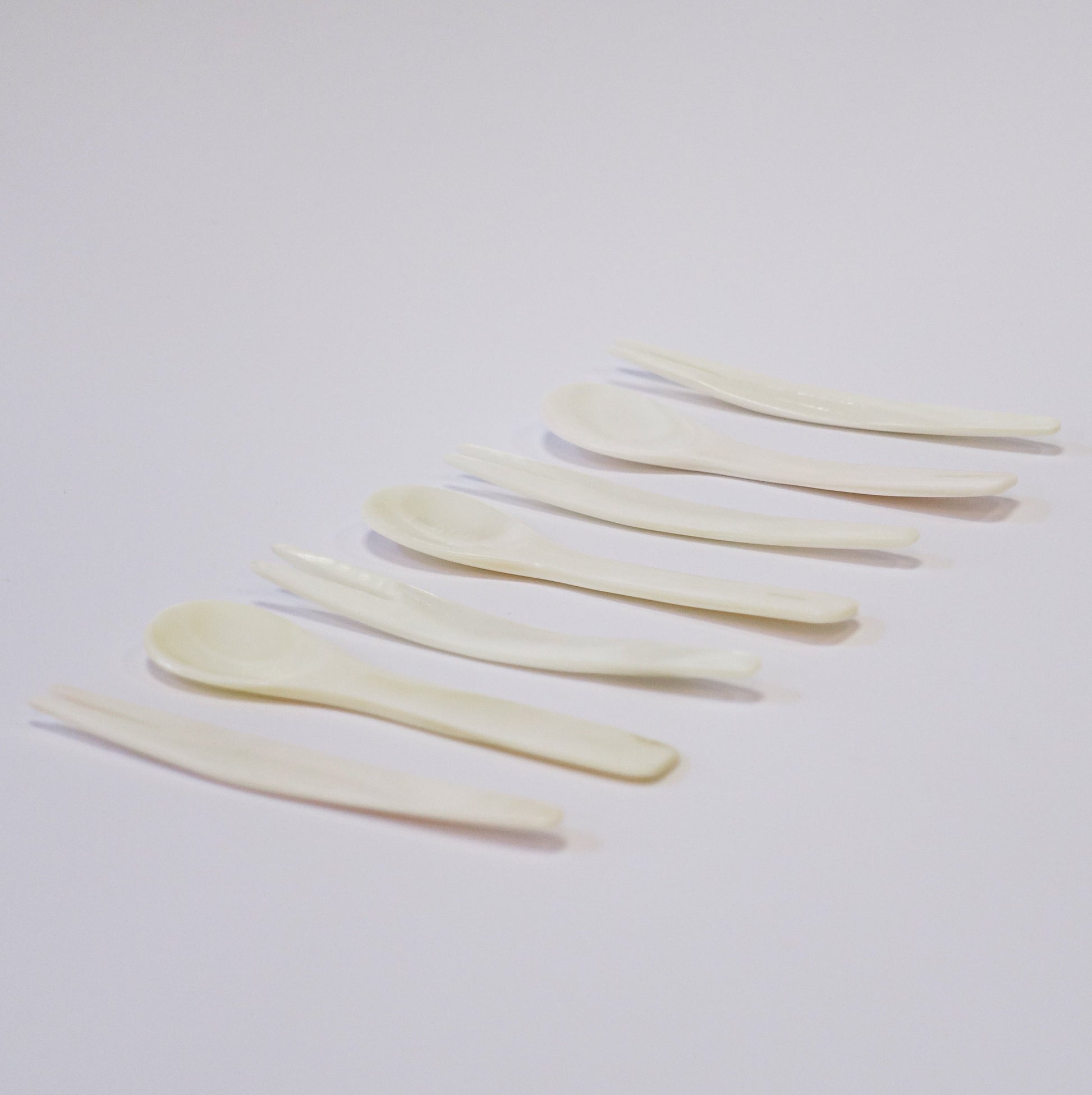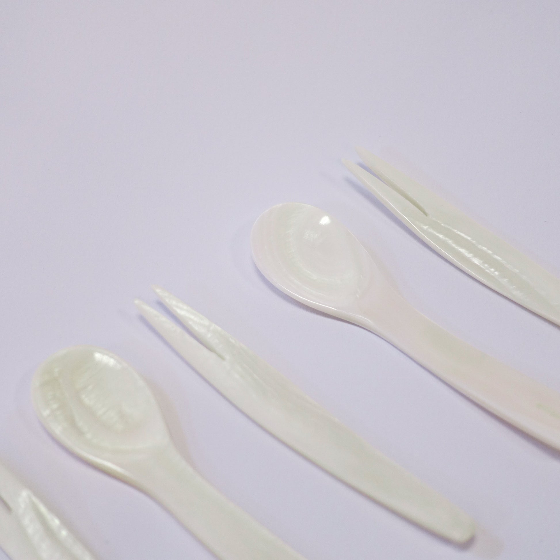 Handgefertigter Minilöffel und Spieß aus weißem Perlmutt in Größe eines Teelöffels. Der Löffel und der Spieß sind in attraktiver Elfenbeinfarbe mit fließendem Muster gehalten, das für Perlmutt einzigartig ist.